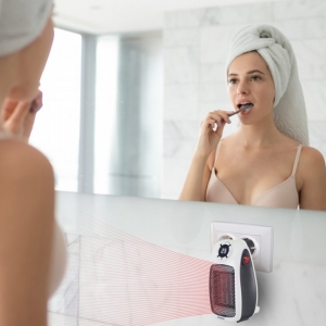 Compact and space-saving ceramic fan heater, perfect for quickly heating spaces such as bathrooms, offices, or bedrooms.