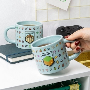 The large 400ml (13 fl oz) blue ceramic mug features embossed details of the Crafter Block and Earth Block on either side. The rest of the mug is covered in inventory items, tools and weapons, making every sip an adventure. Perfect for hot drinks, it's the ideal companion for work, home or gaming sessions.