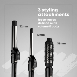3 interchangeable styling attachments: 38mm round brush / 32mm curling tong / 19mm curling tong.
