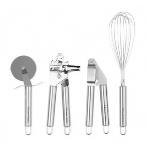Making light work of your meal preparations, this four piece kitchen tool set from Russell Hobbs is an essential for any kitchen. Including a garlic press, whisk, pizza cutter and can opener, this set is perfect, whether cooking pasta, baking a cake or opening a tin. Boasting a stylish design, the utensils are crafted from durable stainless steel and feature a mirror polish finish to compliment any home. Made with users in mind, the tools have convenient hanging hooks for effortless storage.